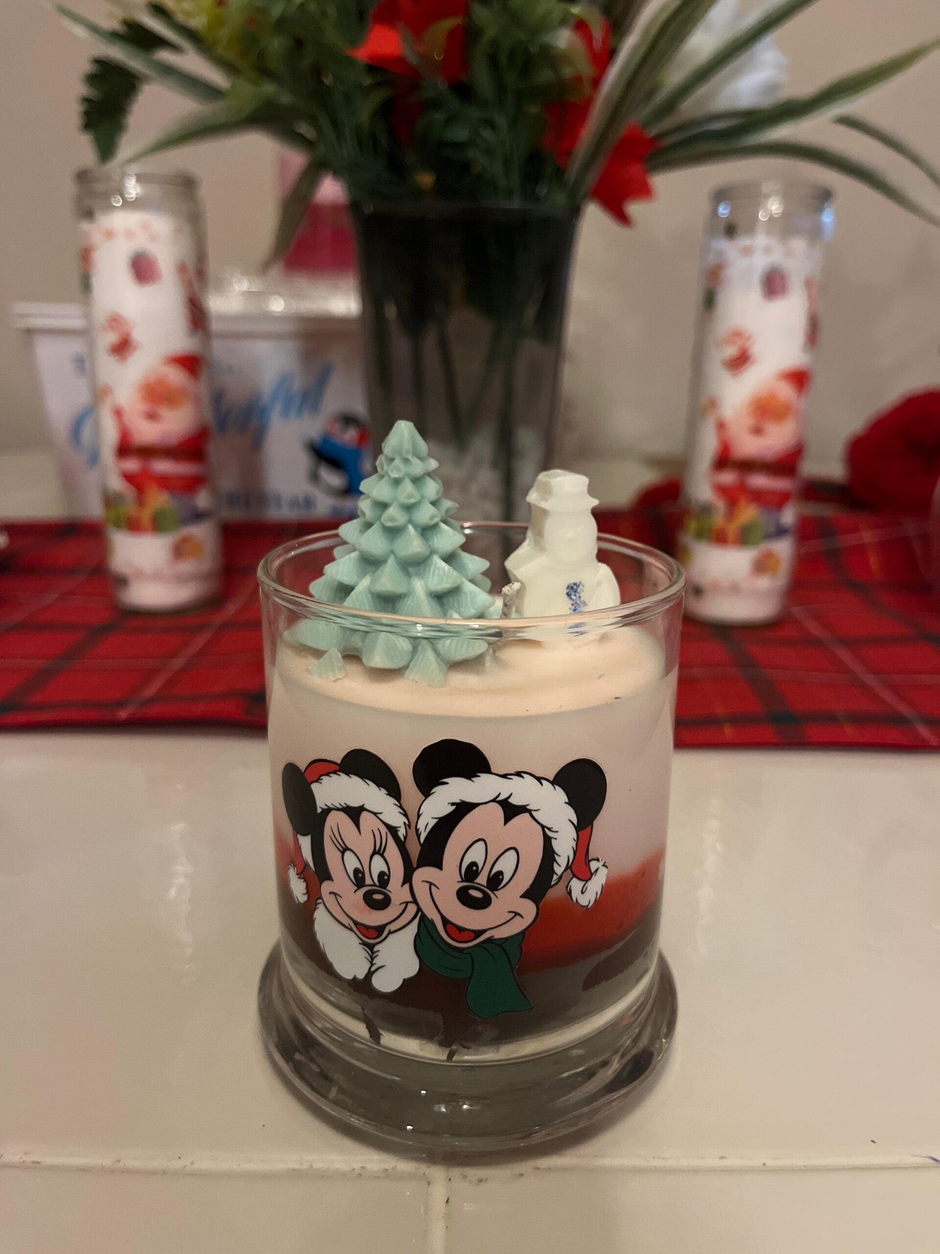 Peppermint and chocolate had a baby and produced this mickey mouse Xmas candle topped with Xmas decorations.